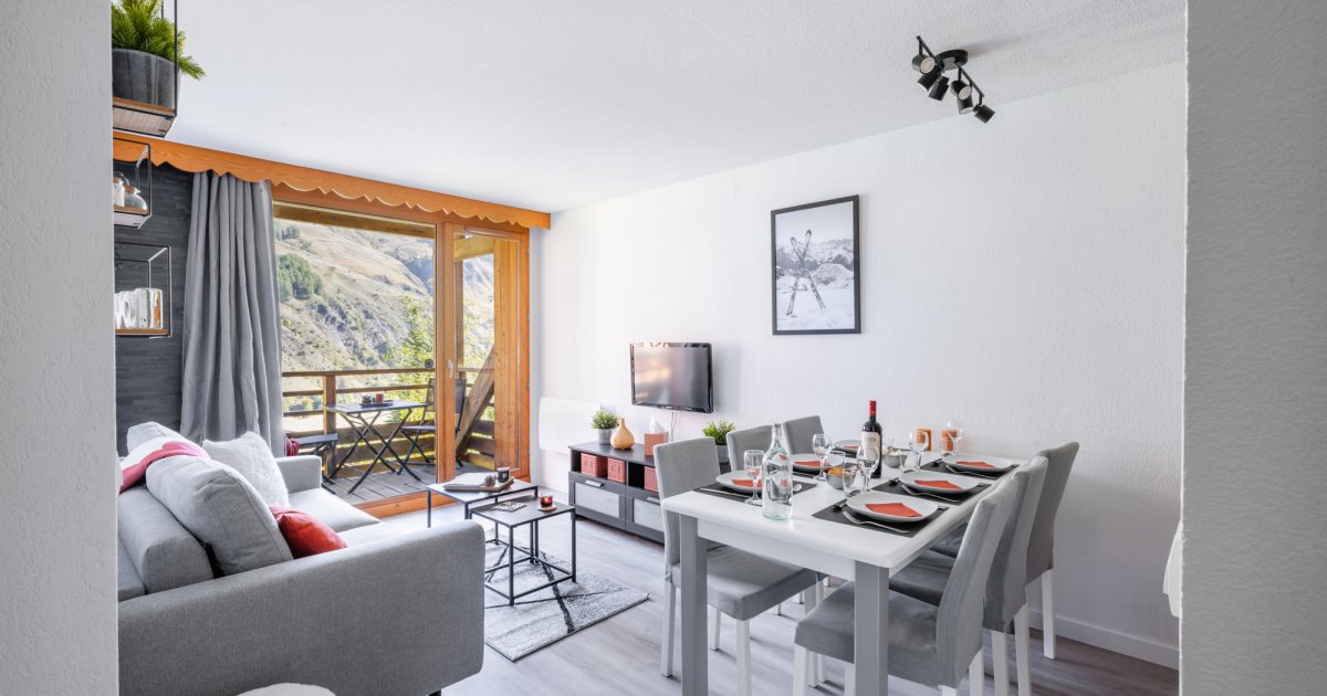 - Belle pièce de vie lumineuse, avec cuisine ouverte sur le salon et grande baie vitrée offrant une vue dégagée et apaisante sur les montagnes.